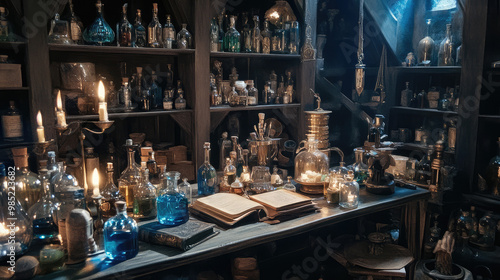 A whimsical witch workshop filled with potion bottles, spell books, and magical item.