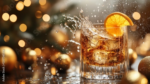 A whiskey glass with ice and an orange slice garnished, splashing against a festive background of blurred lights and ornaments