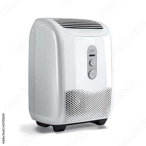 A white air purifier with rounded edges and a perforated front panel on a white background.