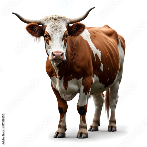 a white and brown cow bull cattle bovine with horns, isolated on a white background