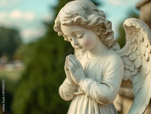 A white angel statue is praying with its hands together