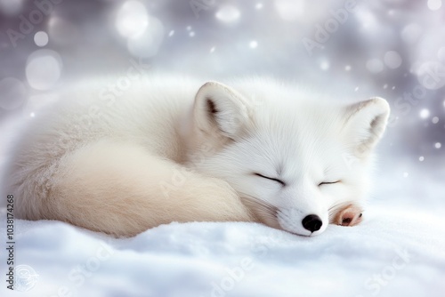 A white arctic fox curls up peacefully in the snow under soft daylight in a tranquil winter landscape