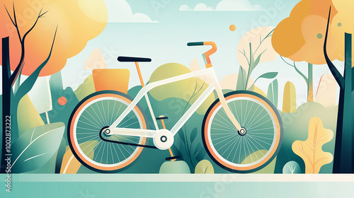 A white bicycle parked in front of a colorful forest background