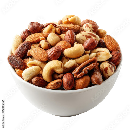 A white bowl filled with a mix of nuts. Various nuts, including almonds, cashews, hazelnuts, and pecans, are visible. High angle, close-up view