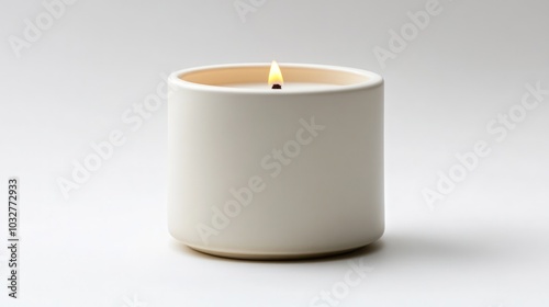 A white candle with a single wick is burning brightly against a white background.