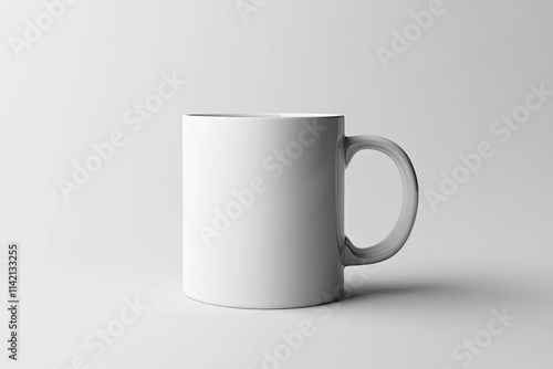 A white ceramic coffee mug featuring a handle is placed on a white surface