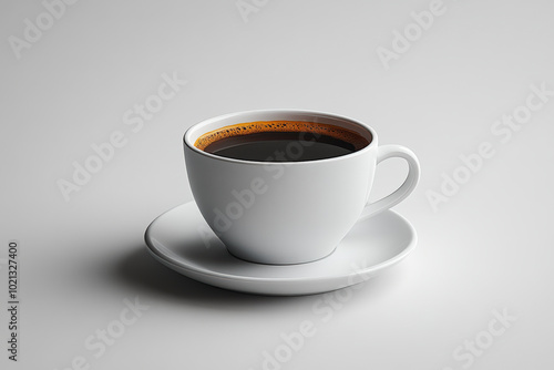 A white ceramic cup filled with dark coffee rests on a matching saucer against a plain, light background, creating a simple, elegant scene.