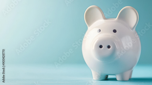 A white ceramic piggy bank stands on a light blue surface, symbolizing saving money, financial planning, and investment for future security and wealth building.