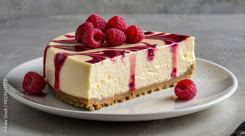 a white chocolate raspberry cheesecake, with a creamy white chocolate filling swirled with vibrant raspberry jam, set on a buttery graham cracker crust