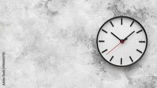 A white clock with black hands and numbers on a gray background.