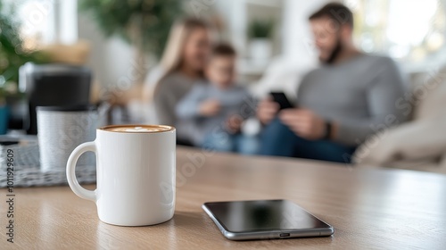 A white coffee mug and smartphone rest on a table, as a blurred family sits together in the background, enjoying quality time in a cozy living room setting.