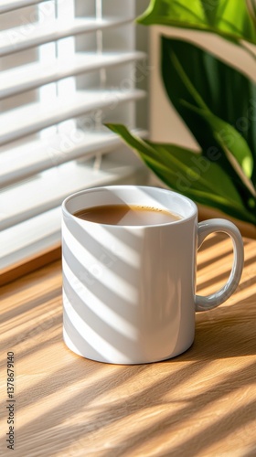 A white coffee mug with a brown liquid in it sits on a wooden table