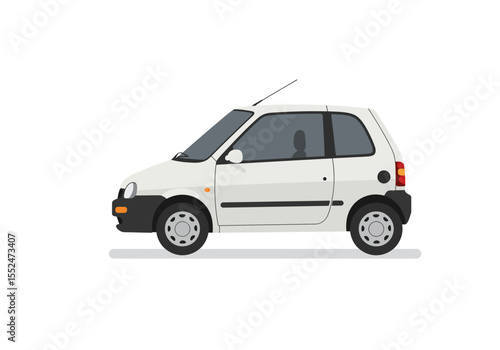 A white compact car is depicted in a vector illustration against a white background