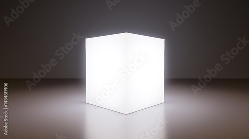 A white cube illuminated from the top, casting a shadow on the floor below.