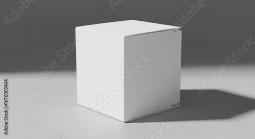A white cube is displayed, likely a 3D render. The cube sits on a gray surface with a cast shadow, viewed at eye level.