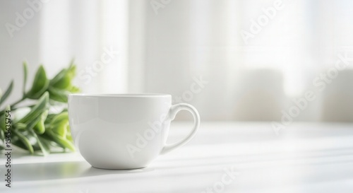 A white cup with a handle on a white surface, accompanied by a green plant with leaves in the background.