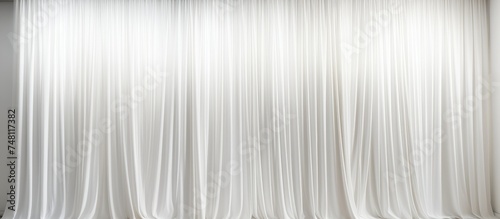 A white curtain is hanging on a wall next to a window, creating a simple and clean look in the room. The curtain is neatly arranged and adds a touch of elegance to the space.