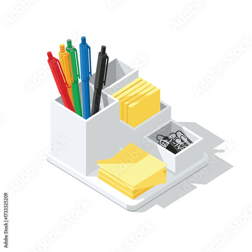 A white desk organizer with pens sticky notes and paper clips on a white background in a studio shot