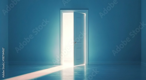 A white door with light shining through, the door open in the middle of an empty room with blue walls