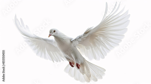 A white dove flies gracefully against a clean white background, symbolizing peace and freedom. It can be used to represent hope, love, and faith.