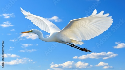 A white egret in mid-flight, captured from below, its wings arched gracefully as it soars against a clear blue sky with clouds scattered above.