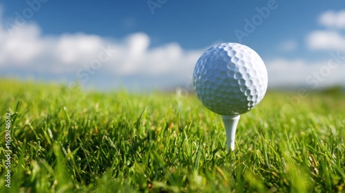 A white golf ball sits on a tee in lush green grass, surrounded by an expansive landscape. Fluffy clouds drift across the blue sky, creating a serene golfing atmosphere.
