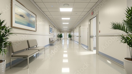 a white hospital hallway, contemporary medical design, with a waiting bench, and open space against a bright wall.