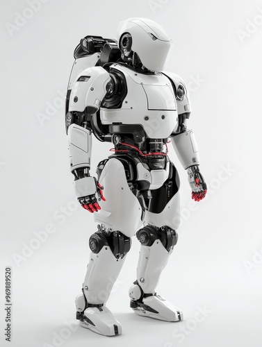 A white humanoid robot with red accents stands against a white background, showcasing its advanced design and intricate details. The robot represents technological advancement, artificial intelligenc