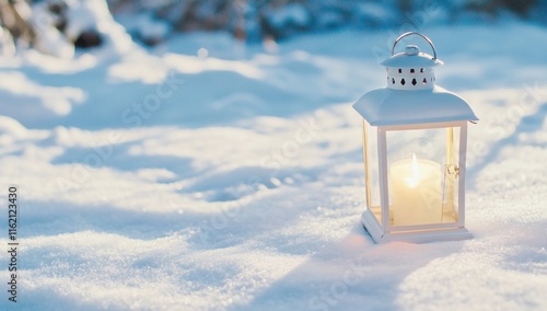 A white lantern glowing softly in fresh snow, creating a serene ambiance.