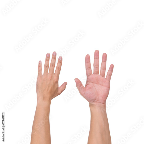 A white male hand gesture showing a finger count on a white background. clipping path.