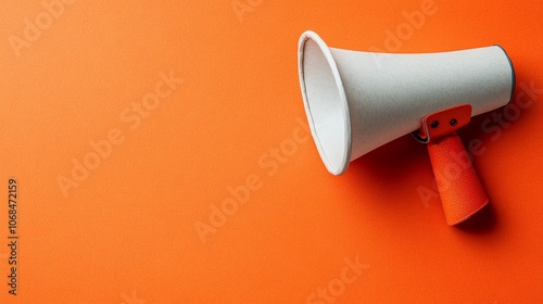 A white megaphone with an orange handle on an orange background, with copy space to the left.