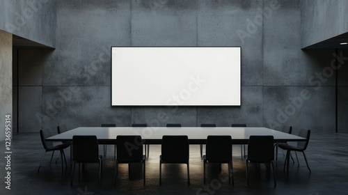 A white mockup of an empty horizontal frame on the wall in front of a black conference table, with black chairs around it. The concrete walls and professional lighting create a gray background