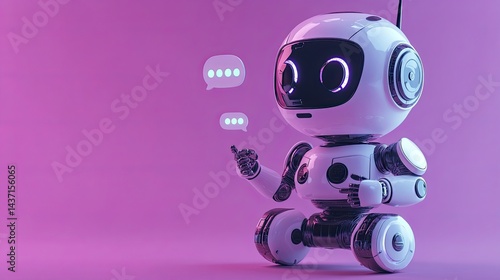 A white modern robot engaging in conversation with chat bubbles on a purple background.