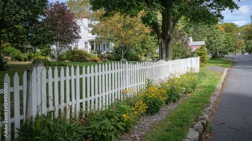 A white picket fence with flowers and trees in the background, along with a house in the distance.