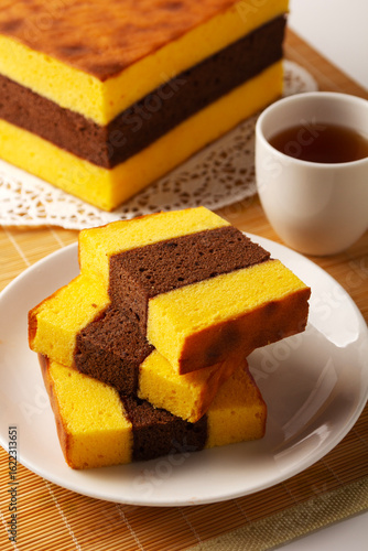 A white plate holds several slices of a rich Lapis Surabaya cake, with the rest of the cake and a cup of tea visible in the background