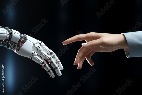 A white robot hand gently reaching out to touch a human hand symbolizes the profound and evolving connection between humanity and technology, depicted in a mysterious and captivating dark setting