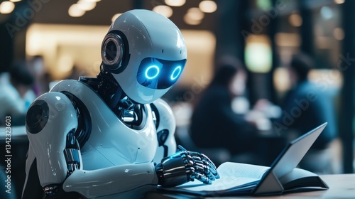 A white robot is studying a book at a table