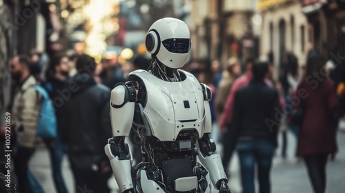 A white robot with a complex design stands in a city street surrounded by blurred people.