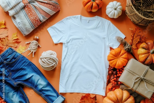 A white shirt is on a table with a pile of autumn leaves and pumpkins. Scene is cozy and festive