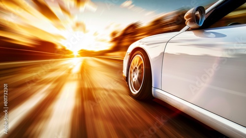 A white sports car speeding on a highway under a bright sun, conveying a sense of motion and freedom.
