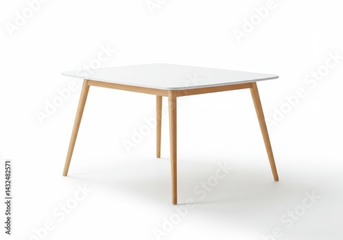 A white topped table with light wood legs isolated on a white background in a studio setting