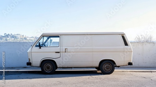 A white van parked on the side of a road with a white wall in the background.