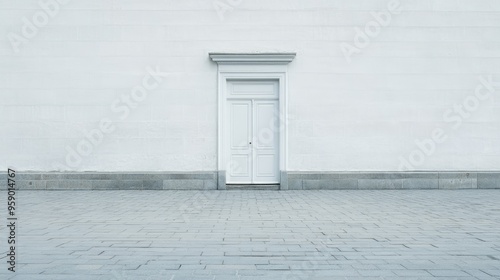 A white wooden front door enhanced by glass panels and surrounded by decorative plants against a clean white wall with black accents