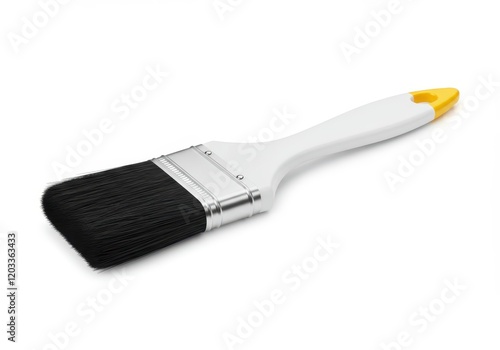 A white-handled paintbrush with a broad black bristle and a yellow accent at the tip isolated on white background