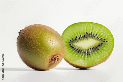 A whole kiwi and a half-sliced kiwi are placed side by side on a clean white surface, showcasing their vibrant green color. The image highlights the kiwi's texture and freshness.