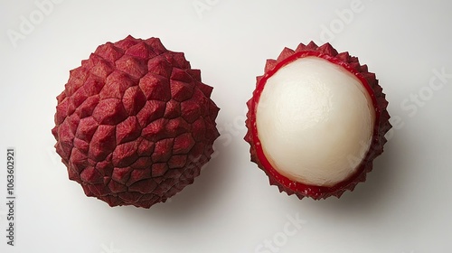 A whole lychee with textured red skin and another peeled to show white flesh and dark seed, isolated on a clean white background.