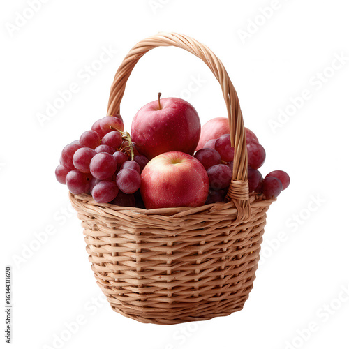 A wicker basket filled with fresh red apples and grapes, set against a white isolated background.