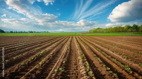 A wide and expansive field marked by brown and green stripes featuring an abundance of soil and vegetation
