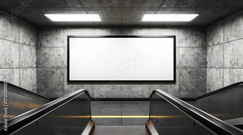 A wide, eye-level shot of a large, blank rectangular billboard framed in black, mounted on a weathered concrete wall in an underground setting, like a subway station.