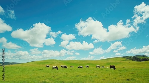 A wide open green pasture with grazing cows under a bright blue sky, capturing the essence of rural life.